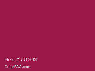 Hex #991848 Color is a normal rose color and the nearest color is Big Dip O Ruby #9c2542. Hex code #991848 and RGB value is rgb(153,24,72). In RGB color space, this color is composed of 60% red, 9% green, 28% blue, In CMYK color space, this color is composed of 0% cyan, 84% magenta, 53% yellow , 40% black , In HSL color space, this color has a hue angle of 338° , 73% saturation and 35% lightness.
