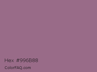 Hex #996b88 Color is a normal magenta color and the nearest color is Strikemaster #956387. Hex code #996b88 and RGB value is rgb(153,107,136). In RGB color space, this color is composed of 60% red, 42% green, 53% blue, In CMYK color space, this color is composed of 0% cyan, 30% magenta, 11% yellow , 40% black , In HSL color space, this color has a hue angle of 322° , 18% saturation and 51% lightness.