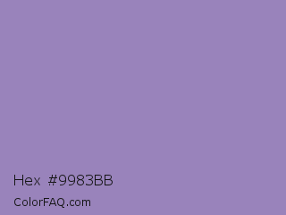Hex #9983bb Color is a light violet color and the nearest color is Lavender Purple #967bb6. Hex code #9983bb and RGB value is rgb(153,131,187). In RGB color space, this color is composed of 60% red, 51% green, 73% blue, In CMYK color space, this color is composed of 18% cyan, 30% magenta, 0% yellow , 27% black , In HSL color space, this color has a hue angle of 264° , 29% saturation and 62% lightness.