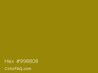 Hex #998808 Color is a normal yellow color and the nearest color is Dark Yellow #9b870c. Hex code #998808 and RGB value is rgb(153,136,8). In RGB color space, this color is composed of 60% red, 53% green, 3% blue, In CMYK color space, this color is composed of 0% cyan, 11% magenta, 95% yellow , 40% black , In HSL color space, this color has a hue angle of 53° , 90% saturation and 32% lightness.