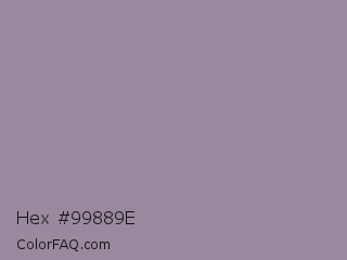 Hex #99889e Color is a normal purple color and the nearest color is Mountain Mist #959396. Hex code #99889e and RGB value is rgb(153,136,158). In RGB color space, this color is composed of 60% red, 53% green, 62% blue, In CMYK color space, this color is composed of 3% cyan, 14% magenta, 0% yellow , 38% black , In HSL color space, this color has a hue angle of 286° , 10% saturation and 58% lightness.