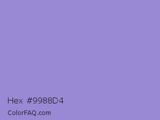 Hex #9988d4 Color is a light indigo color and the nearest color is Blue Bell Crayola #9999cc. Hex code #9988d4 and RGB value is rgb(153,136,212). In RGB color space, this color is composed of 60% red, 53% green, 83% blue, In CMYK color space, this color is composed of 28% cyan, 36% magenta, 0% yellow , 17% black , In HSL color space, this color has a hue angle of 253° , 47% saturation and 68% lightness.