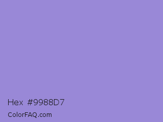 Hex #9988d7 Color is a light indigo color and the nearest color is Blue Bell Crayola #9999cc. Hex code #9988d7 and RGB value is rgb(153,136,215). In RGB color space, this color is composed of 60% red, 53% green, 84% blue, In CMYK color space, this color is composed of 29% cyan, 37% magenta, 0% yellow , 16% black , In HSL color space, this color has a hue angle of 253° , 50% saturation and 69% lightness.