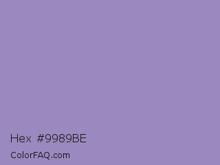 Hex #9989be Color is a light indigo color and the nearest color is Lavender Purple #967bb6. Hex code #9989be and RGB value is rgb(153,137,190). In RGB color space, this color is composed of 60% red, 54% green, 75% blue, In CMYK color space, this color is composed of 19% cyan, 28% magenta, 0% yellow , 25% black , In HSL color space, this color has a hue angle of 258° , 29% saturation and 64% lightness.