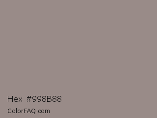 Hex #998b88 Color is a normal red color and the nearest color is Venus #928590. Hex code #998b88 and RGB value is rgb(153,139,136). In RGB color space, this color is composed of 60% red, 55% green, 53% blue, In CMYK color space, this color is composed of 0% cyan, 9% magenta, 11% yellow , 40% black , In HSL color space, this color has a hue angle of 11° , 8% saturation and 57% lightness.