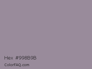 Hex #998b9b Color is a normal magenta color and the nearest color is Mountain Mist #959396. Hex code #998b9b and RGB value is rgb(153,139,155). In RGB color space, this color is composed of 60% red, 55% green, 61% blue, In CMYK color space, this color is composed of 1% cyan, 10% magenta, 0% yellow , 39% black , In HSL color space, this color has a hue angle of 293° , 7% saturation and 58% lightness.