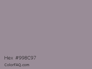 Hex #998c97 Color is a normal magenta color and the nearest color is Mountain Mist #959396. Hex code #998c97 and RGB value is rgb(153,140,151). In RGB color space, this color is composed of 60% red, 55% green, 59% blue, In CMYK color space, this color is composed of 0% cyan, 8% magenta, 1% yellow , 40% black , In HSL color space, this color has a hue angle of 309° , 6% saturation and 57% lightness.