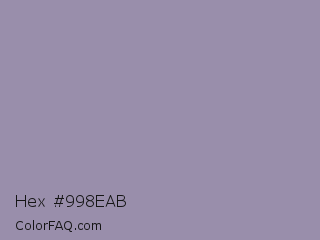 Hex #998eab Color is a light violet color and the nearest color is Manatee #979aaa. Hex code #998eab and RGB value is rgb(153,142,171). In RGB color space, this color is composed of 60% red, 56% green, 67% blue, In CMYK color space, this color is composed of 11% cyan, 17% magenta, 0% yellow , 33% black , In HSL color space, this color has a hue angle of 263° , 15% saturation and 61% lightness.