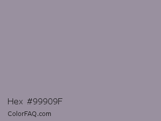 Hex #99909f Color is a normal purple color and the nearest color is Mountain Mist #959396. Hex code #99909f and RGB value is rgb(153,144,159). In RGB color space, this color is composed of 60% red, 56% green, 62% blue, In CMYK color space, this color is composed of 4% cyan, 9% magenta, 0% yellow , 38% black , In HSL color space, this color has a hue angle of 276° , 7% saturation and 59% lightness.
