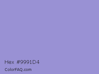 Hex #9991d4 Color is a light indigo color and the nearest color is Blue Bell Crayola #9999cc. Hex code #9991d4 and RGB value is rgb(153,145,212). In RGB color space, this color is composed of 60% red, 57% green, 83% blue, In CMYK color space, this color is composed of 28% cyan, 32% magenta, 0% yellow , 17% black , In HSL color space, this color has a hue angle of 247° , 44% saturation and 70% lightness.