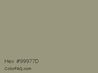 Hex #99977d Color is a normal yellow color and the nearest color is Gurkha #9a9577. Hex code #99977d and RGB value is rgb(153,151,125). In RGB color space, this color is composed of 60% red, 59% green, 49% blue, In CMYK color space, this color is composed of 0% cyan, 1% magenta, 18% yellow , 40% black , In HSL color space, this color has a hue angle of 56° , 12% saturation and 55% lightness.