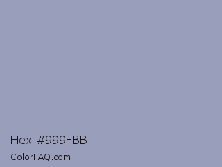 Hex #999fbb Color is a light blue color and the nearest color is Santas Gray #9fa0b1. Hex code #999fbb and RGB value is rgb(153,159,187). In RGB color space, this color is composed of 60% red, 62% green, 73% blue, In CMYK color space, this color is composed of 18% cyan, 15% magenta, 0% yellow , 27% black , In HSL color space, this color has a hue angle of 229° , 20% saturation and 67% lightness.