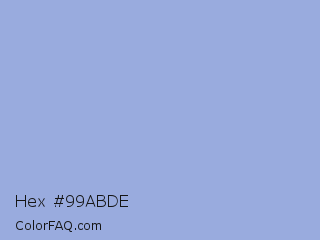 Hex #99abde Color is a light blue color and the nearest color is Wistful #a4a6d3. Hex code #99abde and RGB value is rgb(153,171,222). In RGB color space, this color is composed of 60% red, 67% green, 87% blue, In CMYK color space, this color is composed of 31% cyan, 23% magenta, 0% yellow , 13% black , In HSL color space, this color has a hue angle of 224° , 51% saturation and 74% lightness.