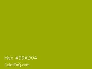 Hex #99ad04 Color is a normal yellow color and the nearest color is Apple Green #8db600. Hex code #99ad04 and RGB value is rgb(153,173,4). In RGB color space, this color is composed of 60% red, 68% green, 2% blue, In CMYK color space, this color is composed of 12% cyan, 0% magenta, 98% yellow , 32% black , In HSL color space, this color has a hue angle of 67° , 95% saturation and 35% lightness.