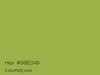 Hex #99b349 Color is a normal lime color and the nearest color is Sushi #87ab39. Hex code #99b349 and RGB value is rgb(153,179,73). In RGB color space, this color is composed of 60% red, 70% green, 29% blue, In CMYK color space, this color is composed of 15% cyan, 0% magenta, 59% yellow , 30% black , In HSL color space, this color has a hue angle of 75° , 42% saturation and 49% lightness.