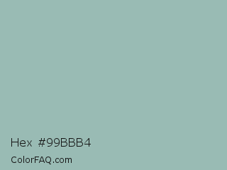 Hex #99bbb4 Color is a light cyan color and the nearest color is Shadow Green #9ac2b8. Hex code #99bbb4 and RGB value is rgb(153,187,180). In RGB color space, this color is composed of 60% red, 73% green, 71% blue, In CMYK color space, this color is composed of 18% cyan, 0% magenta, 4% yellow , 27% black , In HSL color space, this color has a hue angle of 168° , 20% saturation and 67% lightness.