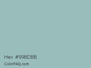 Hex #99bdbb Color is a light cyan color and the nearest color is Shadow Green #9ac2b8. Hex code #99bdbb and RGB value is rgb(153,189,187). In RGB color space, this color is composed of 60% red, 74% green, 73% blue, In CMYK color space, this color is composed of 19% cyan, 0% magenta, 1% yellow , 26% black , In HSL color space, this color has a hue angle of 177° , 21% saturation and 67% lightness.