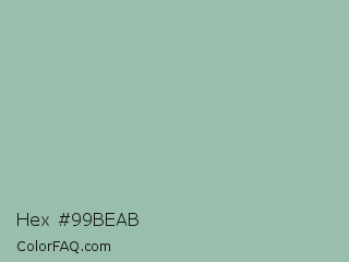 Hex #99beab Color is a light green color and the nearest color is Summer Green #96bbab. Hex code #99beab and RGB value is rgb(153,190,171). In RGB color space, this color is composed of 60% red, 75% green, 67% blue, In CMYK color space, this color is composed of 19% cyan, 0% magenta, 10% yellow , 25% black , In HSL color space, this color has a hue angle of 149° , 22% saturation and 67% lightness.