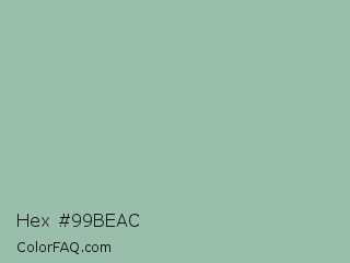 Hex #99beac Color is a light green color and the nearest color is Summer Green #96bbab. Hex code #99beac and RGB value is rgb(153,190,172). In RGB color space, this color is composed of 60% red, 75% green, 67% blue, In CMYK color space, this color is composed of 19% cyan, 0% magenta, 9% yellow , 25% black , In HSL color space, this color has a hue angle of 151° , 22% saturation and 67% lightness.