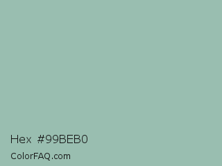 Hex #99beb0 Color is a light green color and the nearest color is Summer Green #96bbab. Hex code #99beb0 and RGB value is rgb(153,190,176). In RGB color space, this color is composed of 60% red, 75% green, 69% blue, In CMYK color space, this color is composed of 19% cyan, 0% magenta, 7% yellow , 25% black , In HSL color space, this color has a hue angle of 157° , 22% saturation and 67% lightness.