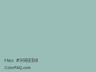 Hex #99beb8 Color is a light cyan color and the nearest color is Shadow Green #9ac2b8. Hex code #99beb8 and RGB value is rgb(153,190,184). In RGB color space, this color is composed of 60% red, 75% green, 72% blue, In CMYK color space, this color is composed of 19% cyan, 0% magenta, 3% yellow , 25% black , In HSL color space, this color has a hue angle of 170° , 22% saturation and 67% lightness.