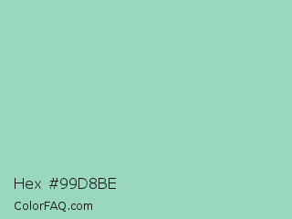 Hex #99d8be Color is a light green color and the nearest color is Algae Green #93dfb8. Hex code #99d8be and RGB value is rgb(153,216,190). In RGB color space, this color is composed of 60% red, 85% green, 75% blue, In CMYK color space, this color is composed of 29% cyan, 0% magenta, 12% yellow , 15% black , In HSL color space, this color has a hue angle of 155° , 45% saturation and 72% lightness.