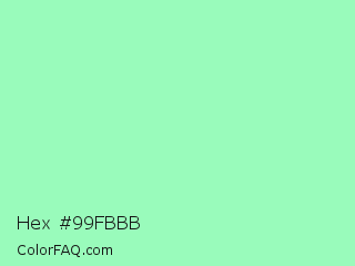 Hex #99fbbb Color is a light green color and the nearest color is Teal Deer #99e6b3. Hex code #99fbbb and RGB value is rgb(153,251,187). In RGB color space, this color is composed of 60% red, 98% green, 73% blue, In CMYK color space, this color is composed of 39% cyan, 0% magenta, 25% yellow , 2% black , In HSL color space, this color has a hue angle of 141° , 92% saturation and 79% lightness.
