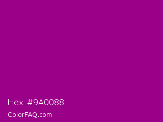 Hex #9a0088 Color is a dark magenta color and the nearest color is Dark Magenta #8b008b. Hex code #9a0088 and RGB value is rgb(154,0,136). In RGB color space, this color is composed of 60% red, 0% green, 53% blue, In CMYK color space, this color is composed of 0% cyan, 100% magenta, 12% yellow , 40% black , In HSL color space, this color has a hue angle of 307° , 100% saturation and 30% lightness.