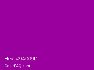 Hex #9a009d Color is a normal magenta color and the nearest color is Violet Eggplant #991199. Hex code #9a009d and RGB value is rgb(154,0,157). In RGB color space, this color is composed of 60% red, 0% green, 62% blue, In CMYK color space, this color is composed of 2% cyan, 100% magenta, 0% yellow , 38% black , In HSL color space, this color has a hue angle of 299° , 100% saturation and 31% lightness.