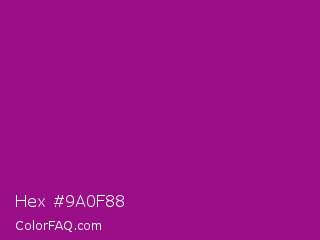 Hex #9a0f88 Color is a normal magenta color and the nearest color is Violet Eggplant #991199. Hex code #9a0f88 and RGB value is rgb(154,15,136). In RGB color space, this color is composed of 60% red, 6% green, 53% blue, In CMYK color space, this color is composed of 0% cyan, 90% magenta, 12% yellow , 40% black , In HSL color space, this color has a hue angle of 308° , 82% saturation and 33% lightness.