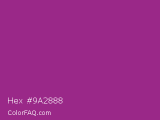 Hex #9a2888 Color is a normal magenta color and the nearest color is Maximum Red Purple #a63a79. Hex code #9a2888 and RGB value is rgb(154,40,136). In RGB color space, this color is composed of 60% red, 16% green, 53% blue, In CMYK color space, this color is composed of 0% cyan, 74% magenta, 12% yellow , 40% black , In HSL color space, this color has a hue angle of 309° , 59% saturation and 38% lightness.