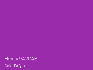 Hex #9a2cab Color is a normal magenta color and the nearest color is Violet Eggplant #991199. Hex code #9a2cab and RGB value is rgb(154,44,171). In RGB color space, this color is composed of 60% red, 17% green, 67% blue, In CMYK color space, this color is composed of 10% cyan, 74% magenta, 0% yellow , 33% black , In HSL color space, this color has a hue angle of 292° , 59% saturation and 42% lightness.