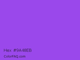Hex #9a48eb Color is a normal violet color and the nearest color is Navy Purple #9457eb. Hex code #9a48eb and RGB value is rgb(154,72,235). In RGB color space, this color is composed of 60% red, 28% green, 92% blue, In CMYK color space, this color is composed of 34% cyan, 69% magenta, 0% yellow , 8% black , In HSL color space, this color has a hue angle of 270° , 80% saturation and 60% lightness.