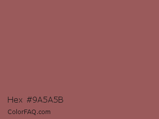Hex #9a5a5b Color is a normal red color and the nearest color is Au Chico #97605d. Hex code #9a5a5b and RGB value is rgb(154,90,91). In RGB color space, this color is composed of 60% red, 35% green, 36% blue, In CMYK color space, this color is composed of 0% cyan, 42% magenta, 41% yellow , 40% black , In HSL color space, this color has a hue angle of 359° , 26% saturation and 48% lightness.