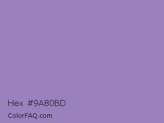 Hex #9a80bd Color is a light violet color and the nearest color is Lavender Purple #967bb6. Hex code #9a80bd and RGB value is rgb(154,128,189). In RGB color space, this color is composed of 60% red, 50% green, 74% blue, In CMYK color space, this color is composed of 19% cyan, 32% magenta, 0% yellow , 26% black , In HSL color space, this color has a hue angle of 266° , 32% saturation and 62% lightness.