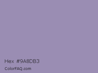 Hex #9a8db3 Color is a light violet color and the nearest color is Amethyst Smoke #a397b4. Hex code #9a8db3 and RGB value is rgb(154,141,179). In RGB color space, this color is composed of 60% red, 55% green, 70% blue, In CMYK color space, this color is composed of 14% cyan, 21% magenta, 0% yellow , 30% black , In HSL color space, this color has a hue angle of 261° , 20% saturation and 63% lightness.