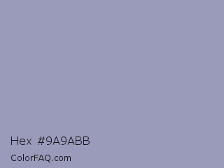 Hex #9a9abb Color is a light blue color and the nearest color is Amethyst Smoke #a397b4. Hex code #9a9abb and RGB value is rgb(154,154,187). In RGB color space, this color is composed of 60% red, 60% green, 73% blue, In CMYK color space, this color is composed of 18% cyan, 18% magenta, 0% yellow , 27% black , In HSL color space, this color has a hue angle of 240° , 20% saturation and 67% lightness.