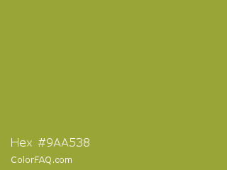 Hex #9aa538 Color is a normal yellow color and the nearest color is Sushi #87ab39. Hex code #9aa538 and RGB value is rgb(154,165,56). In RGB color space, this color is composed of 60% red, 65% green, 22% blue, In CMYK color space, this color is composed of 7% cyan, 0% magenta, 66% yellow , 35% black , In HSL color space, this color has a hue angle of 66° , 49% saturation and 43% lightness.