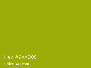 Hex #9aad08 Color is a normal yellow color and the nearest color is Apple Green #8db600. Hex code #9aad08 and RGB value is rgb(154,173,8). In RGB color space, this color is composed of 60% red, 68% green, 3% blue, In CMYK color space, this color is composed of 11% cyan, 0% magenta, 95% yellow , 32% black , In HSL color space, this color has a hue angle of 67° , 91% saturation and 35% lightness.