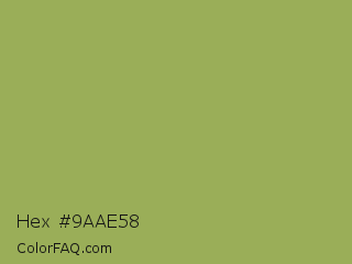 Hex #9aae58 Color is a normal lime color and the nearest color is Chelsea Cucumber #83aa5d. Hex code #9aae58 and RGB value is rgb(154,174,88). In RGB color space, this color is composed of 60% red, 68% green, 35% blue, In CMYK color space, this color is composed of 11% cyan, 0% magenta, 49% yellow , 32% black , In HSL color space, this color has a hue angle of 74° , 35% saturation and 51% lightness.