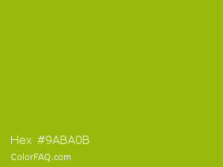 Hex #9aba0b Color is a normal lime color and the nearest color is Pistachio Green #9dc209. Hex code #9aba0b and RGB value is rgb(154,186,11). In RGB color space, this color is composed of 60% red, 73% green, 4% blue, In CMYK color space, this color is composed of 17% cyan, 0% magenta, 94% yellow , 27% black , In HSL color space, this color has a hue angle of 71° , 89% saturation and 39% lightness.