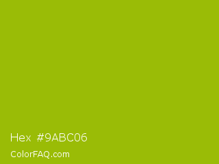 Hex #9abc06 Color is a normal lime color and the nearest color is Pistachio Green #9dc209. Hex code #9abc06 and RGB value is rgb(154,188,6). In RGB color space, this color is composed of 60% red, 74% green, 2% blue, In CMYK color space, this color is composed of 18% cyan, 0% magenta, 97% yellow , 26% black , In HSL color space, this color has a hue angle of 71° , 94% saturation and 38% lightness.