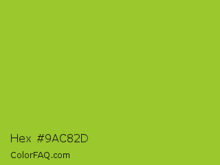 Hex #9ac82d Color is a normal lime color and the nearest color is Atlantis #97cd2d. Hex code #9ac82d and RGB value is rgb(154,200,45). In RGB color space, this color is composed of 60% red, 78% green, 18% blue, In CMYK color space, this color is composed of 23% cyan, 0% magenta, 78% yellow , 22% black , In HSL color space, this color has a hue angle of 78° , 63% saturation and 48% lightness.