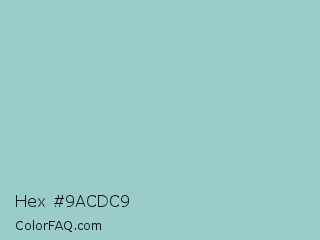 Hex #9acdc9 Color is a light cyan color and the nearest color is Sinbad #9fd7d3. Hex code #9acdc9 and RGB value is rgb(154,205,201). In RGB color space, this color is composed of 60% red, 80% green, 79% blue, In CMYK color space, this color is composed of 25% cyan, 0% magenta, 2% yellow , 20% black , In HSL color space, this color has a hue angle of 175° , 34% saturation and 70% lightness.