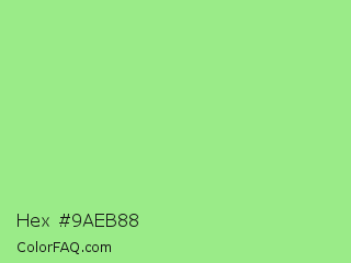 Hex #9aeb88 Color is a light green color and the nearest color is Light Green #90ee90. Hex code #9aeb88 and RGB value is rgb(154,235,136). In RGB color space, this color is composed of 60% red, 92% green, 53% blue, In CMYK color space, this color is composed of 34% cyan, 0% magenta, 42% yellow , 8% black , In HSL color space, this color has a hue angle of 109° , 71% saturation and 73% lightness.