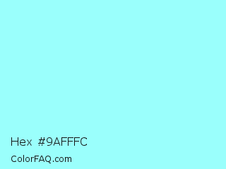 Hex #9afffc Color is a light cyan color and the nearest color is Waterspout #a4f4f9. Hex code #9afffc and RGB value is rgb(154,255,252). In RGB color space, this color is composed of 60% red, 100% green, 99% blue, In CMYK color space, this color is composed of 40% cyan, 0% magenta, 1% yellow , 0% black , In HSL color space, this color has a hue angle of 178° , 100% saturation and 80% lightness.