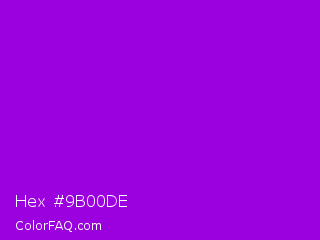 Hex #9b00de Color is a normal purple color and the nearest color is Dark Violet #9400d3. Hex code #9b00de and RGB value is rgb(155,0,222). In RGB color space, this color is composed of 61% red, 0% green, 87% blue, In CMYK color space, this color is composed of 30% cyan, 100% magenta, 0% yellow , 13% black , In HSL color space, this color has a hue angle of 282° , 100% saturation and 44% lightness.