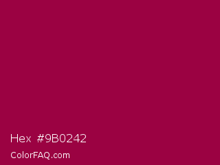 Hex #9b0242 Color is a normal rose color and the nearest color is Pink Raspberry #980036. Hex code #9b0242 and RGB value is rgb(155,2,66). In RGB color space, this color is composed of 61% red, 1% green, 26% blue, In CMYK color space, this color is composed of 0% cyan, 99% magenta, 57% yellow , 39% black , In HSL color space, this color has a hue angle of 335° , 97% saturation and 31% lightness.
