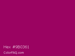 Hex #9b0361 Color is a normal magenta color and the nearest color is Fresh Eggplant #990066. Hex code #9b0361 and RGB value is rgb(155,3,97). In RGB color space, this color is composed of 61% red, 1% green, 38% blue, In CMYK color space, this color is composed of 0% cyan, 98% magenta, 37% yellow , 39% black , In HSL color space, this color has a hue angle of 323° , 96% saturation and 31% lightness.