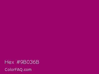 Hex #9b036b Color is a normal magenta color and the nearest color is Fresh Eggplant #990066. Hex code #9b036b and RGB value is rgb(155,3,107). In RGB color space, this color is composed of 61% red, 1% green, 42% blue, In CMYK color space, this color is composed of 0% cyan, 98% magenta, 31% yellow , 39% black , In HSL color space, this color has a hue angle of 319° , 96% saturation and 31% lightness.